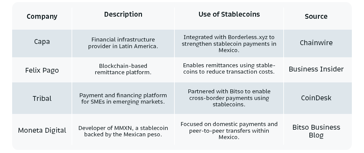 Here’s an overview of how various Mexican companies are adopting stablecoins: